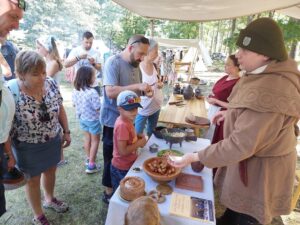 Nádherné počasí přilákalo spolu s pestrým programem slavnostní i obrovské množství návštěvníků, kteří byli lačni ochutnat na čem si naši urození předci pochutnávali na slavnostních banketech. Ačkoliv jsme nápor lidí v rámci degustací předvídali, realita předčila všechna naše očekávání, a tak jsme si doslova prošli křtem ohněm. Přímo na ohni jsme připravili syrné a masové šišky, rejžovou, pšeničnou a jáhlovou kaši. Dále jsme v rámci ochutnávek nabízeli babu makovou, konkavelit z třešní, perníky a syrnou kaši. Návštěvníci si také vyslechli, jak se jednotlivé pokrmy připravovaly a v jakých kombinacích by potom byly v rámci chodů podávány. Mohli si též prohlídnout rozličné kuchyňské nádobí i náčiní.